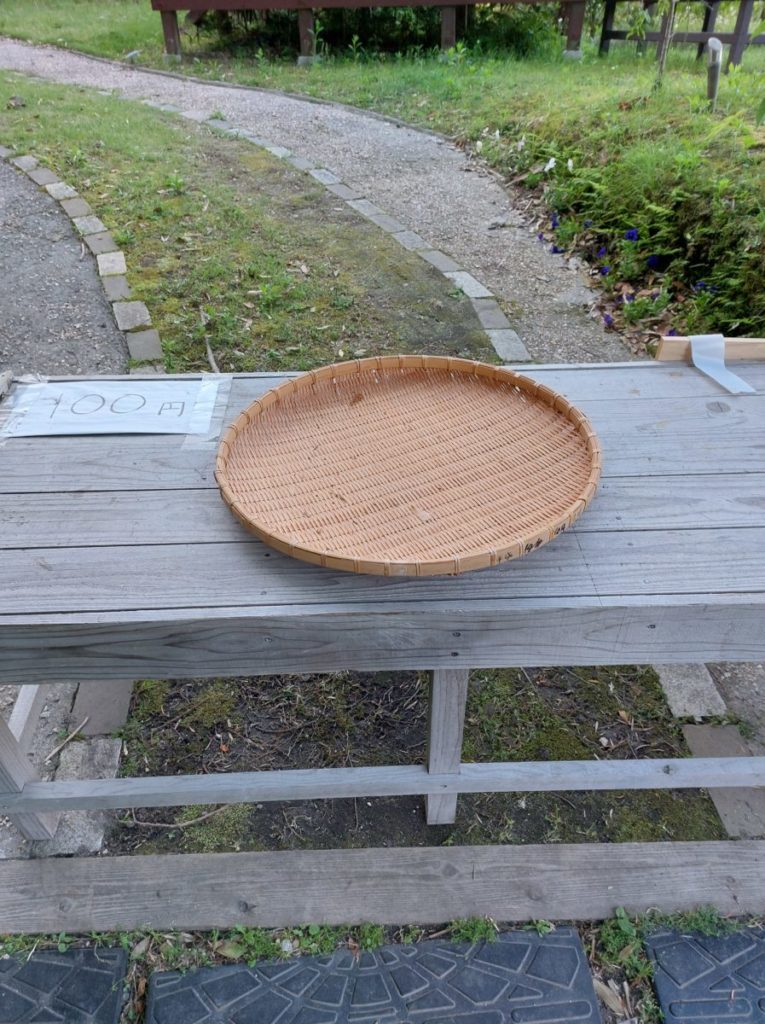 今までは、台の上に野菜を並べていただけの販売所。野菜が転がらないようにざるをおいて、その中に野菜を並べてました。
