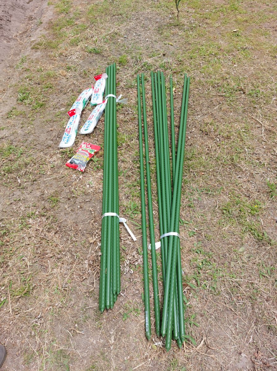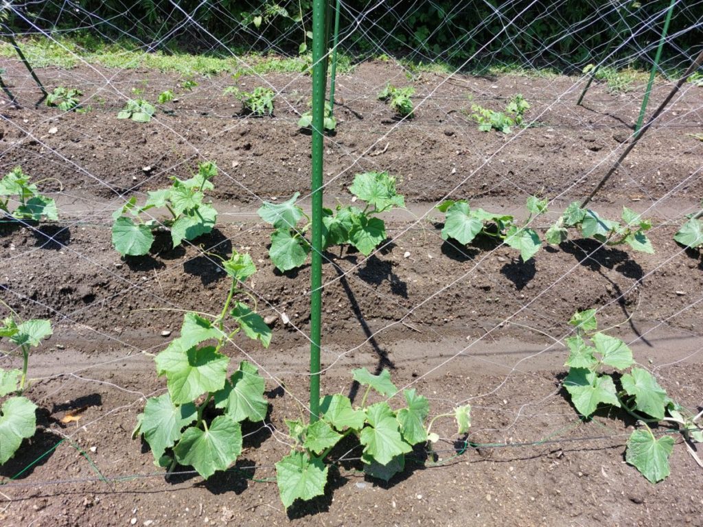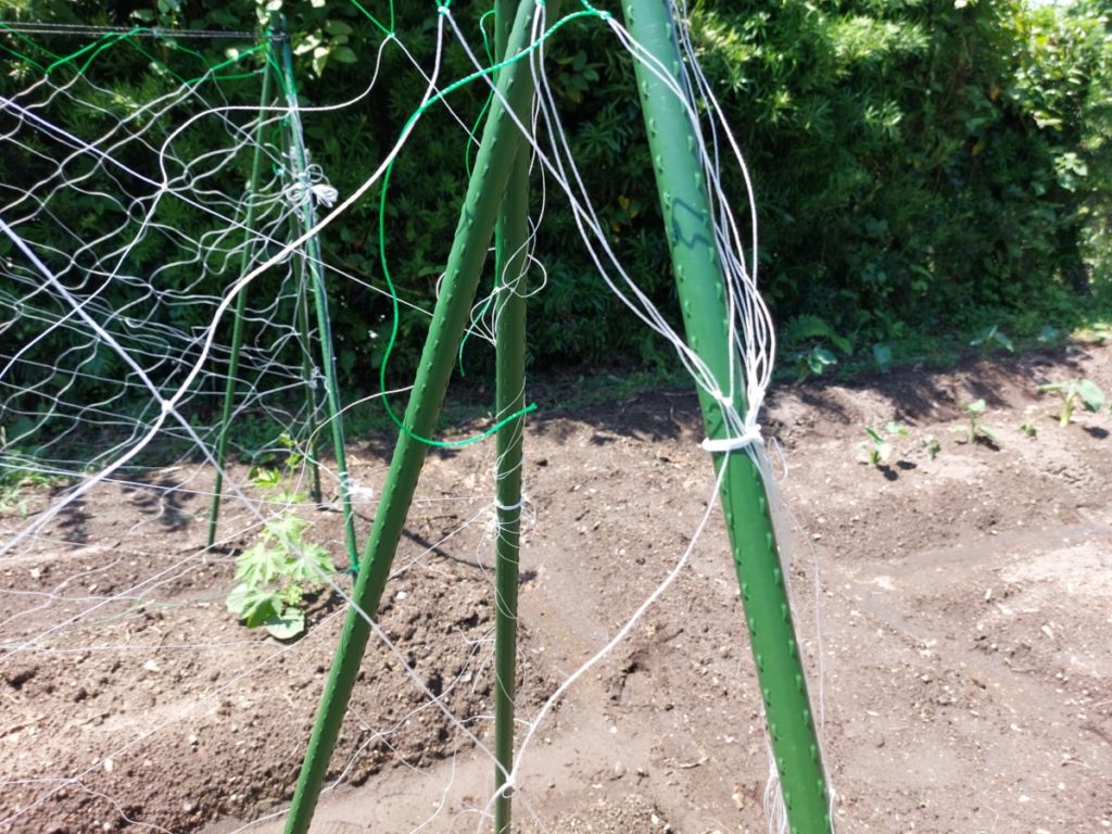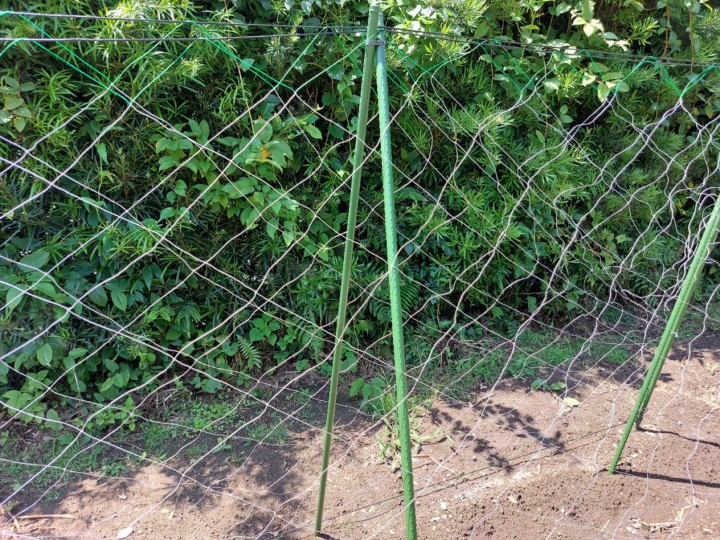 今回はきゅうりの網の縦の長さは180cmにしました。支柱も180cmを用意しましたが、もう少し長めのほうがよいようです。